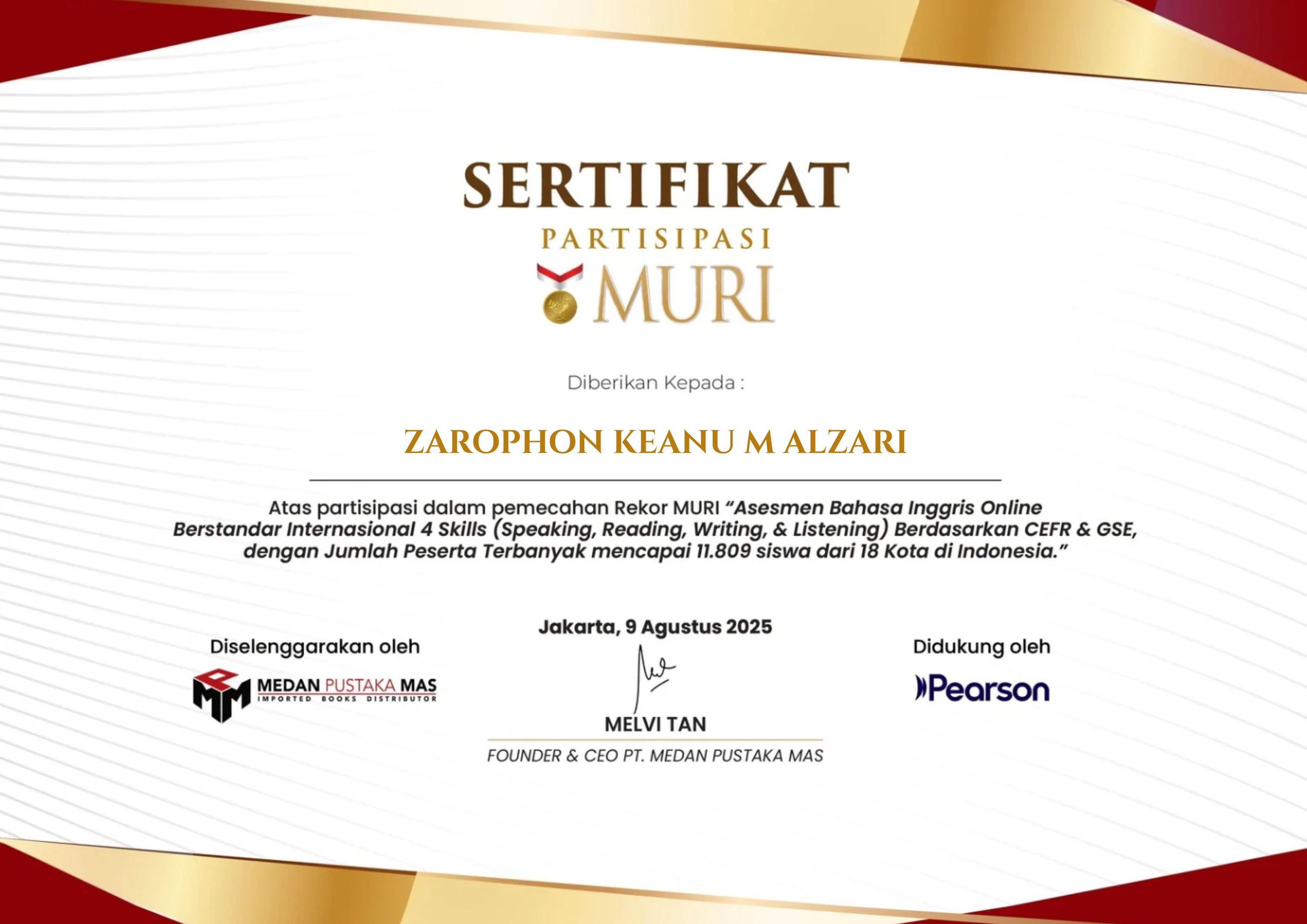 ZAROPHON KEANU M ALZARIKegiatan : Mengikuti perlombaan tingkat Nasional tanggal : 09/08/2025